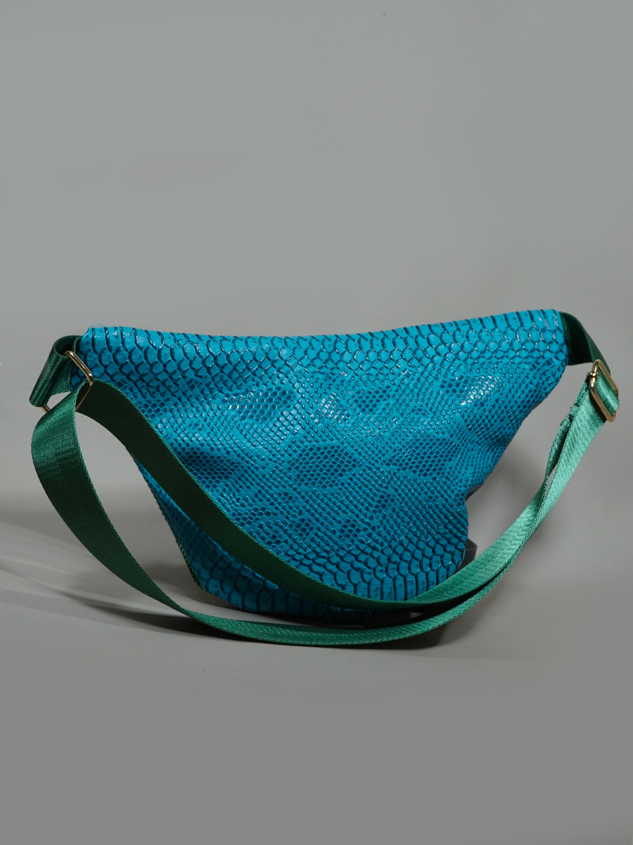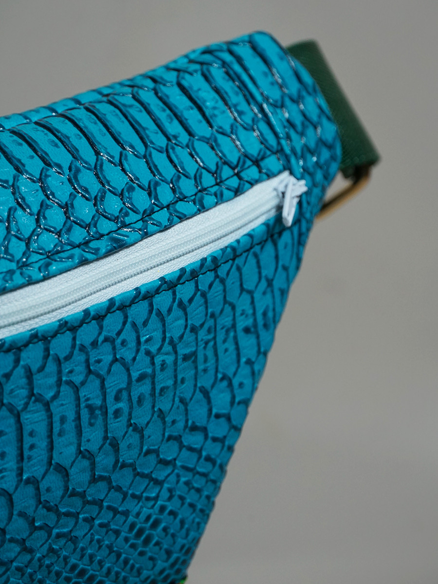 Sac banane en Wax et simili cuir bleu effet peau de crocodile