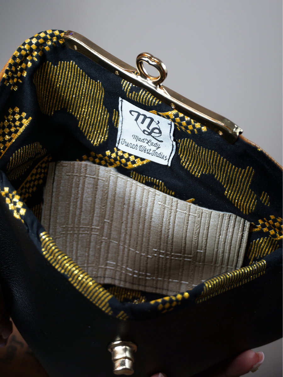 Petit sac en wax et simili cuirs noir et marron en forme de diamant