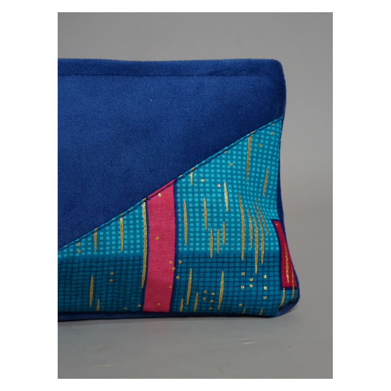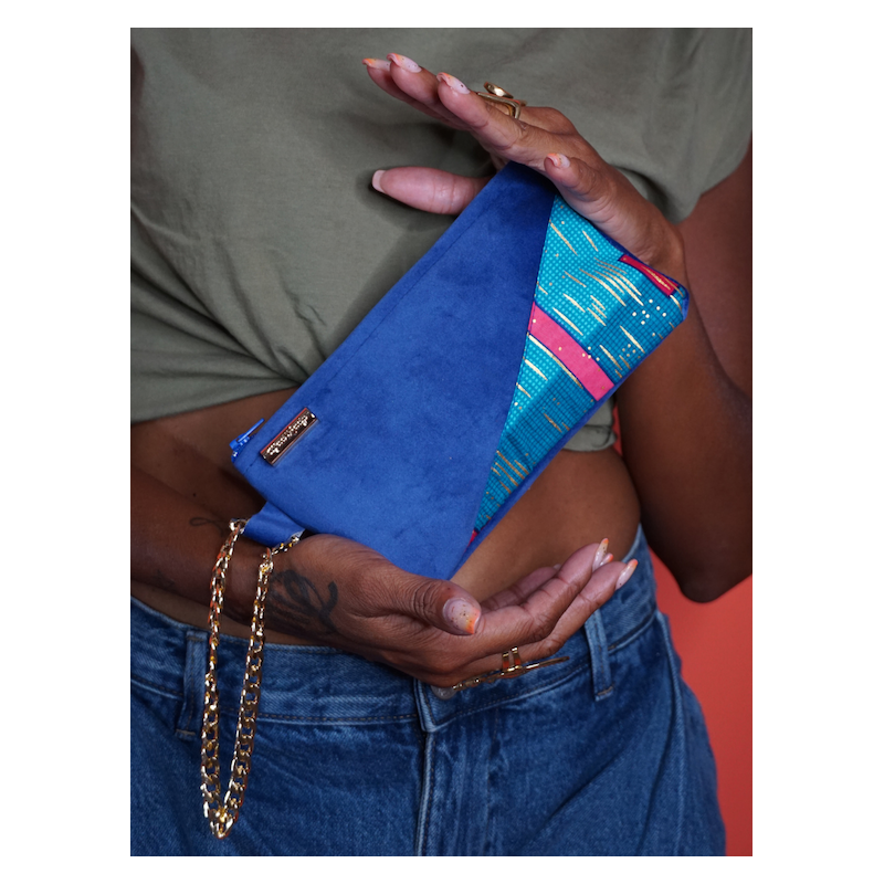 Pochette en Wax et simili cuir bleu jean